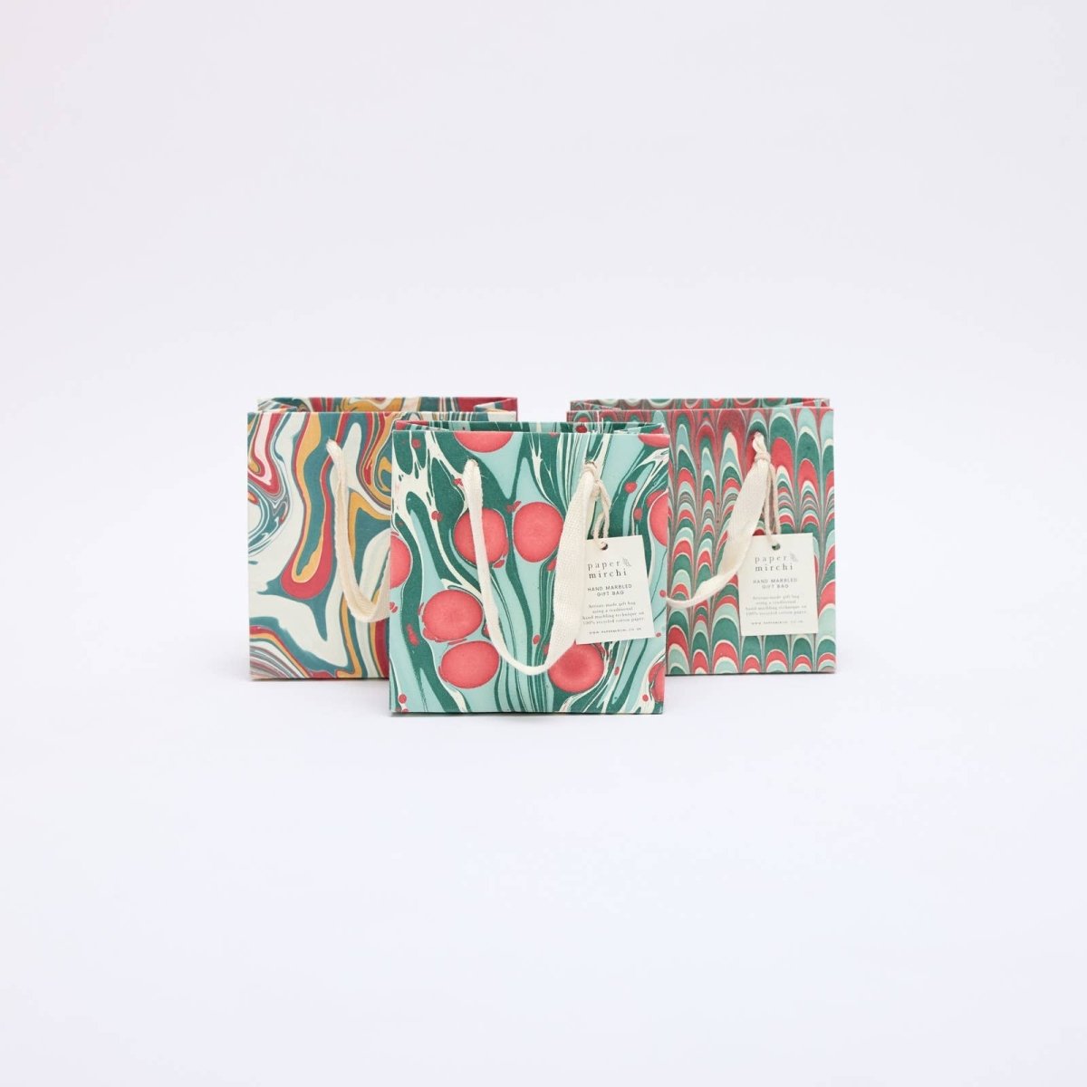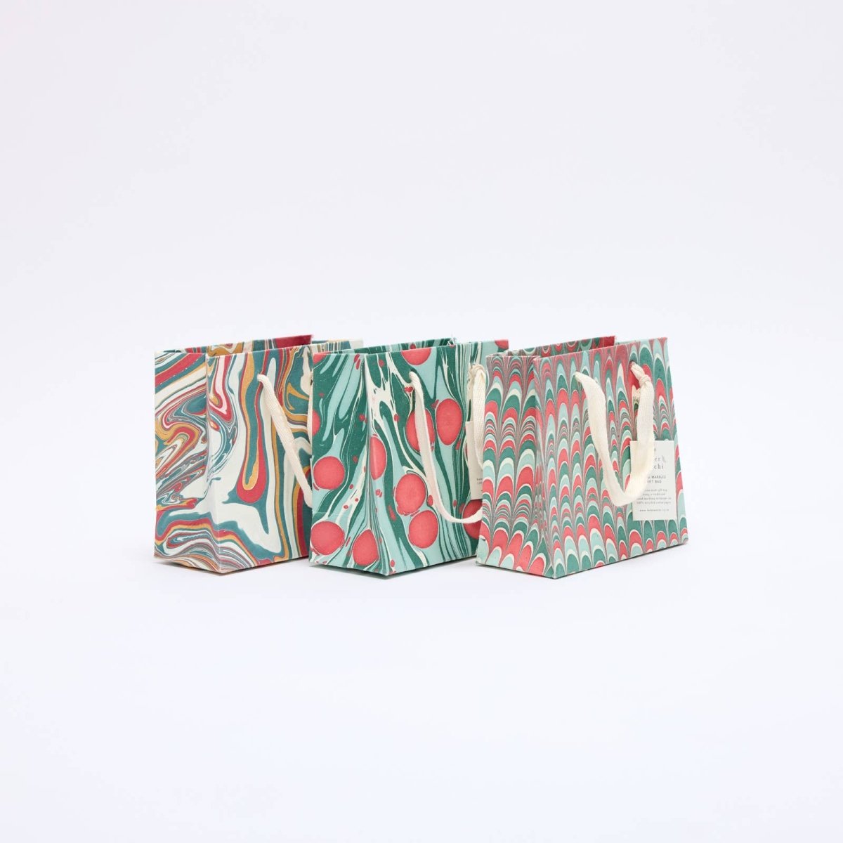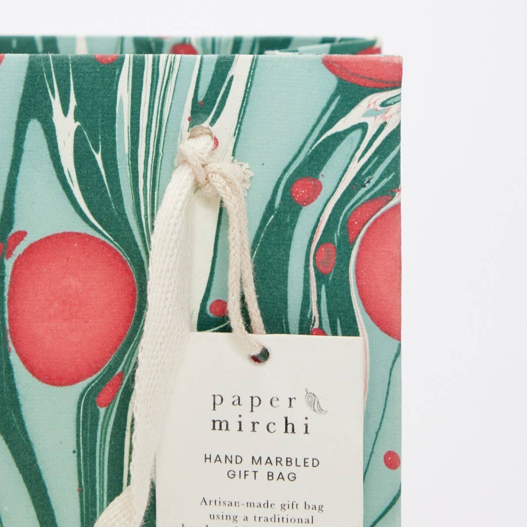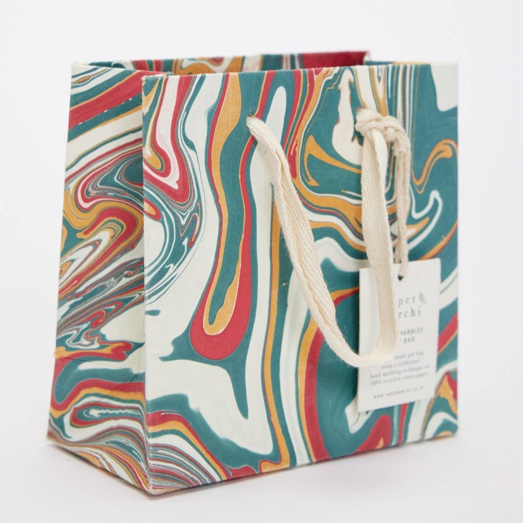 Håndlaget marmorert gavepose. Laget av ark som er dyppet i vannkar med maling på overflaten - derfor er alle posene unike små kunstverk! Mønstrene er ikke trykt med silketrykk eller digitalt masseprodusert.