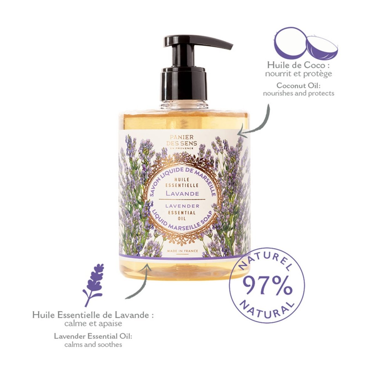 Laget av 100 % vegetabilske oljer og varmsåpebehandlet i kjele etter ekte Marseille-tradisjon for å bevare alle de gode egenskapene i ingrediensene. Med eteriske oljer fra lavendel gjør denne flytende såpen huden deilig myk. På grunn av oljene er den veldig drøy i bruk. Den ser pen ut på vasken, og er en perfekt gave til de som har alt.