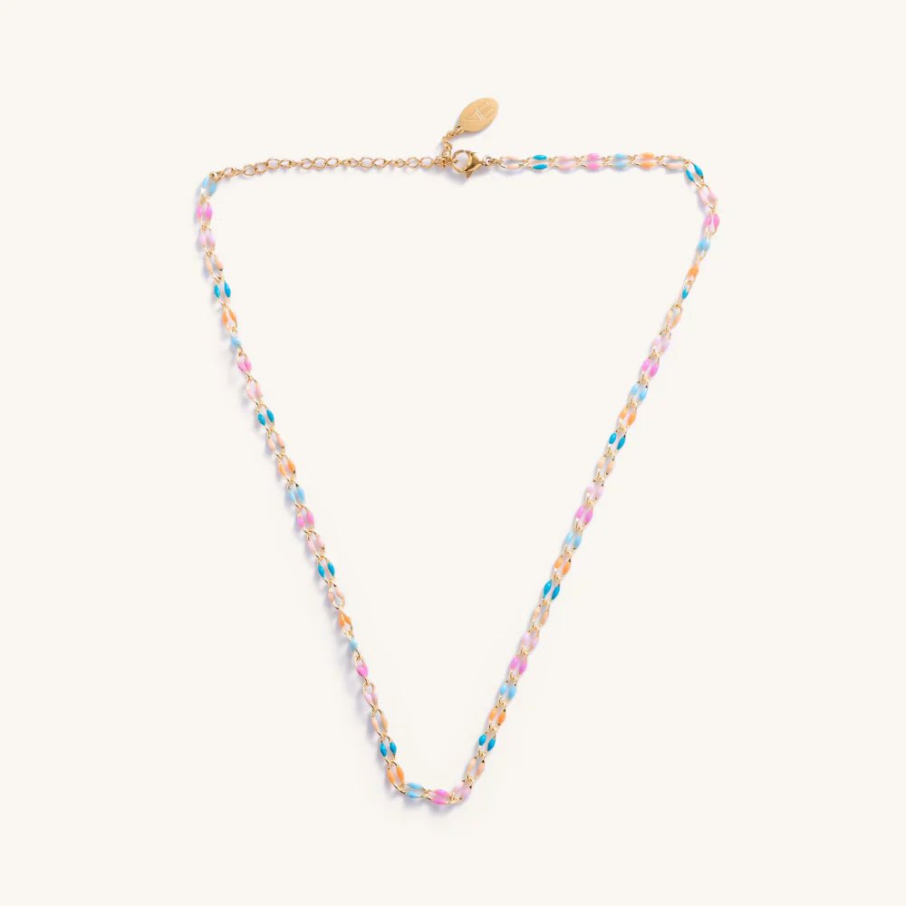 Choker-halssmykke som gir litt ekstra farge og glede - både til hverdag og fest. Finnes også i matchende armbånd. Siden dette smykket er vannfast er det perfekt å bruke om sommeren!