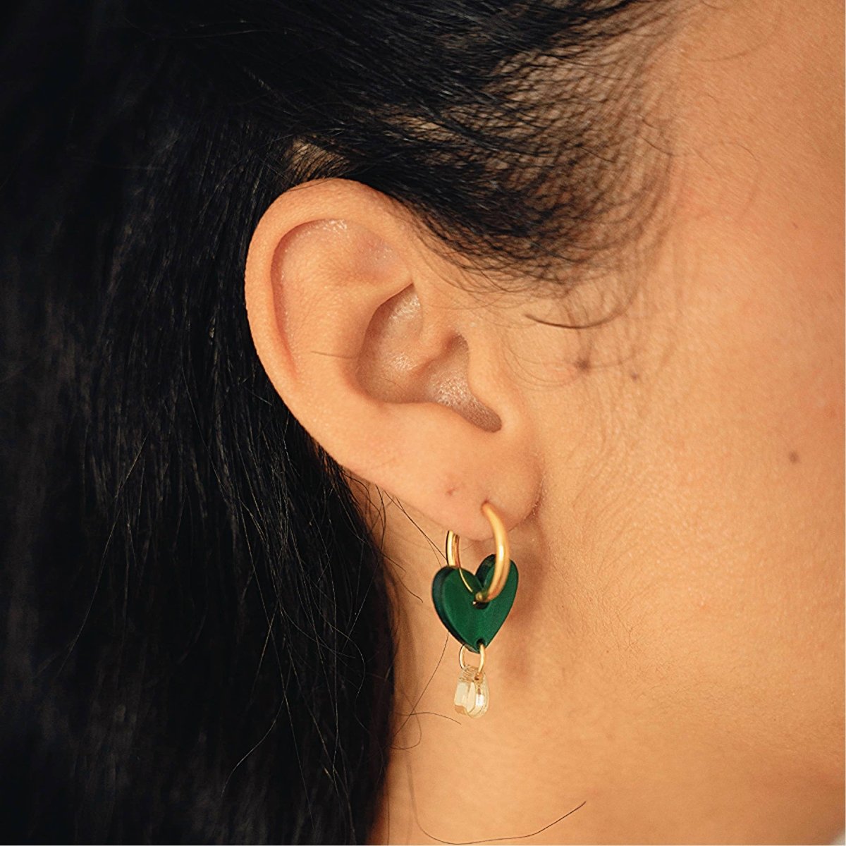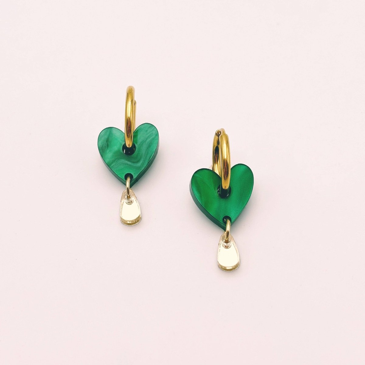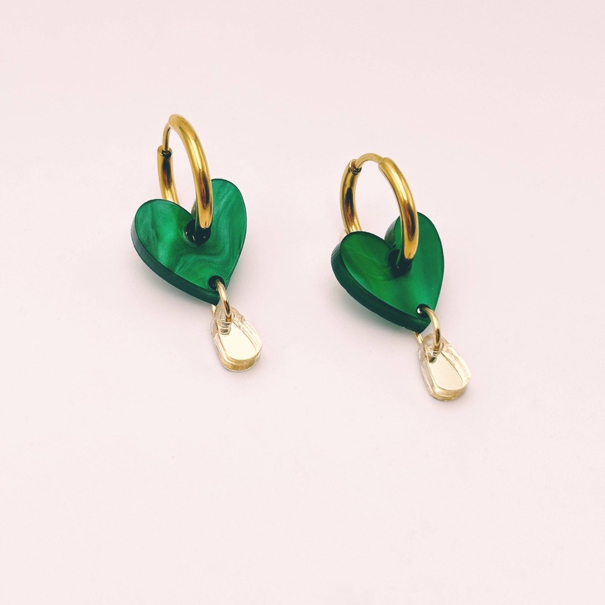 Gi antrekket ditt et romantisk og fargerikt løft med disse nydelige, små marmorerte grønne øredobbene med hjerteform, laget i Frankrike! De vakre marmorerte detaljene i kombinasjon med den elegante gulldråpen vil fange lyset og oppmerksomheten på en sofistikert måte. Disse lekre små øredobbene er designet for å være både iøynefallende og superkomfortable, perfekte til både hverdag og spesielle anledninger.