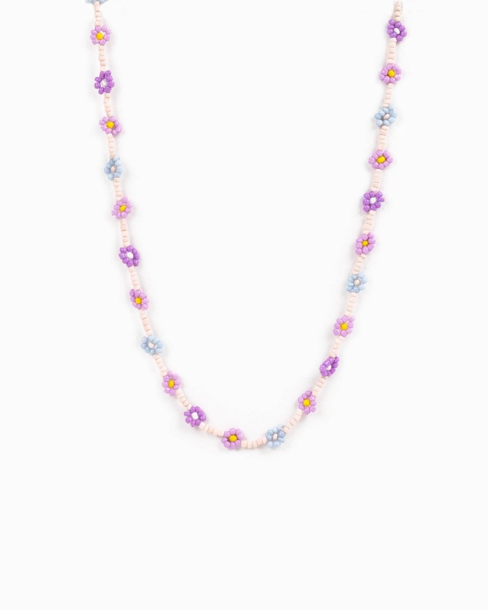Perlekjede med små glassperler formet som blomster i lyseblått og lilla toner. Et lett og lekent smykke som tilfører farge til antrekket. Lås i metall.