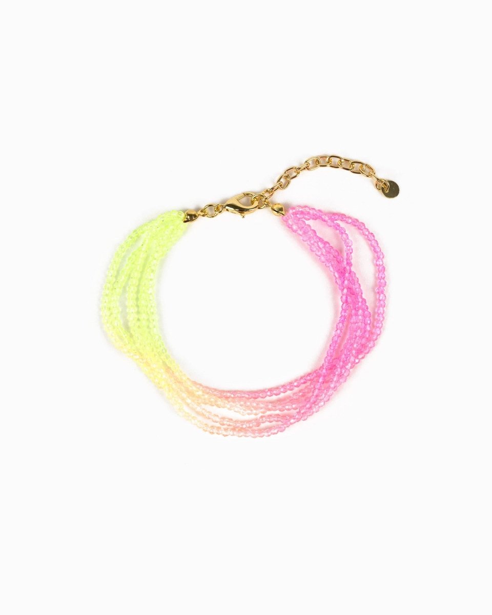 Armbånd med flere lag av små glassperler i en nydelig ombre-effekt. Denne går fra neongul til rosa.