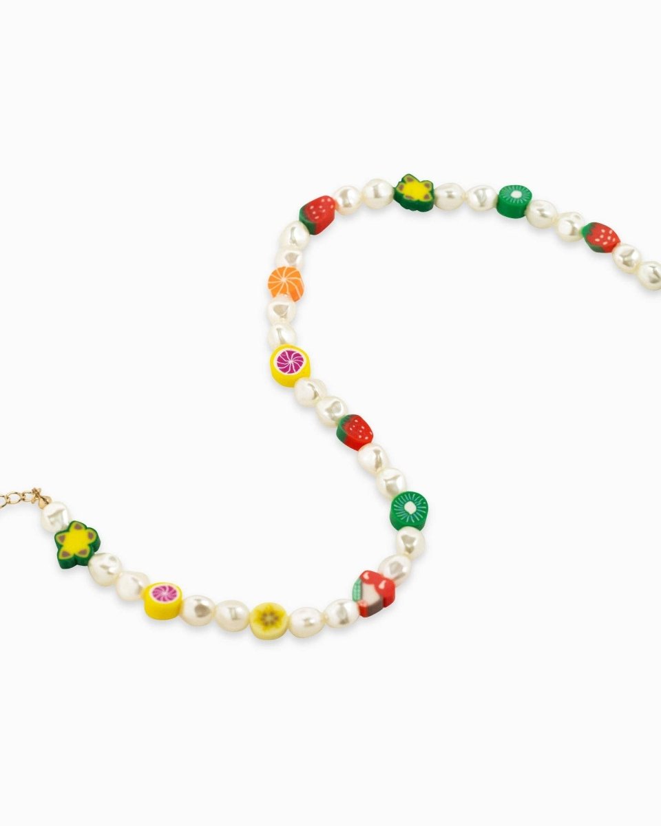 Perlekjede med fargerike frukter som minner om små viskelær. Et lekent smykke som sprer glede!
