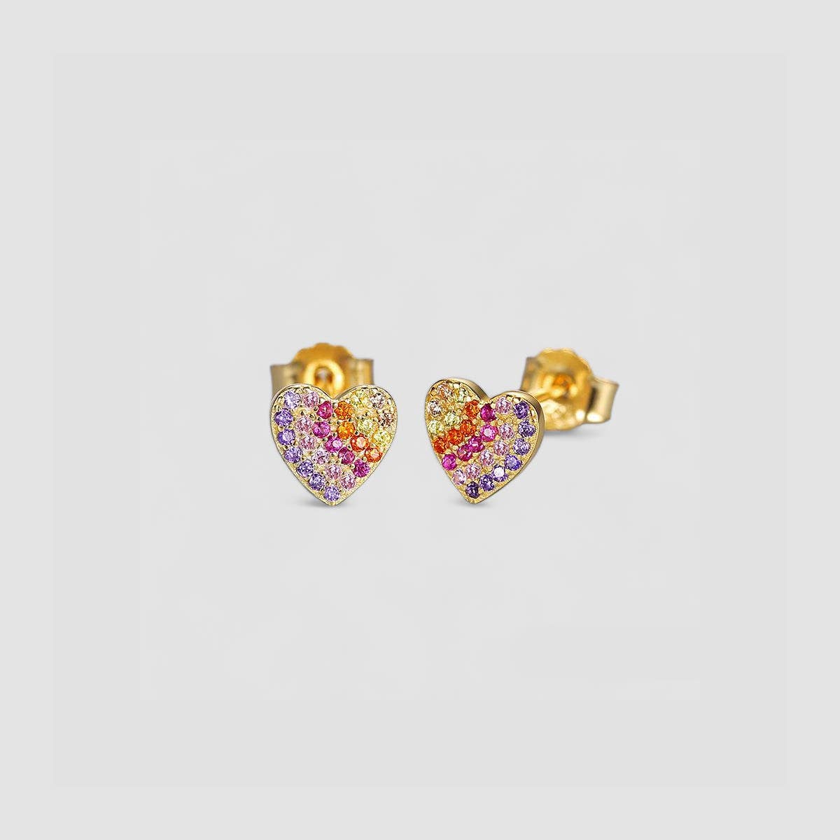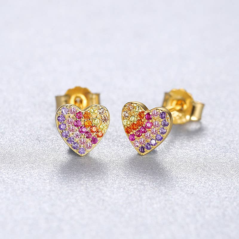 Multifargede Hjerte-Øredobber med Zirkonia laget av ekte sterlingsølv forgylt med gull og pyntet med fargerike zirkonia-steiner.