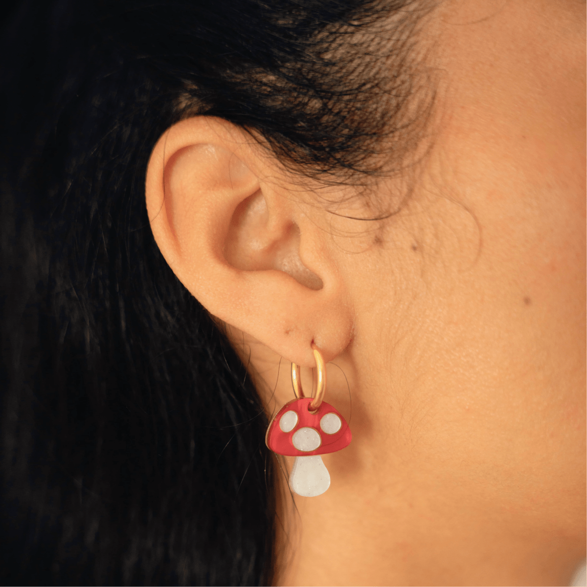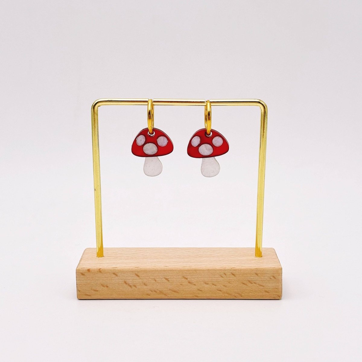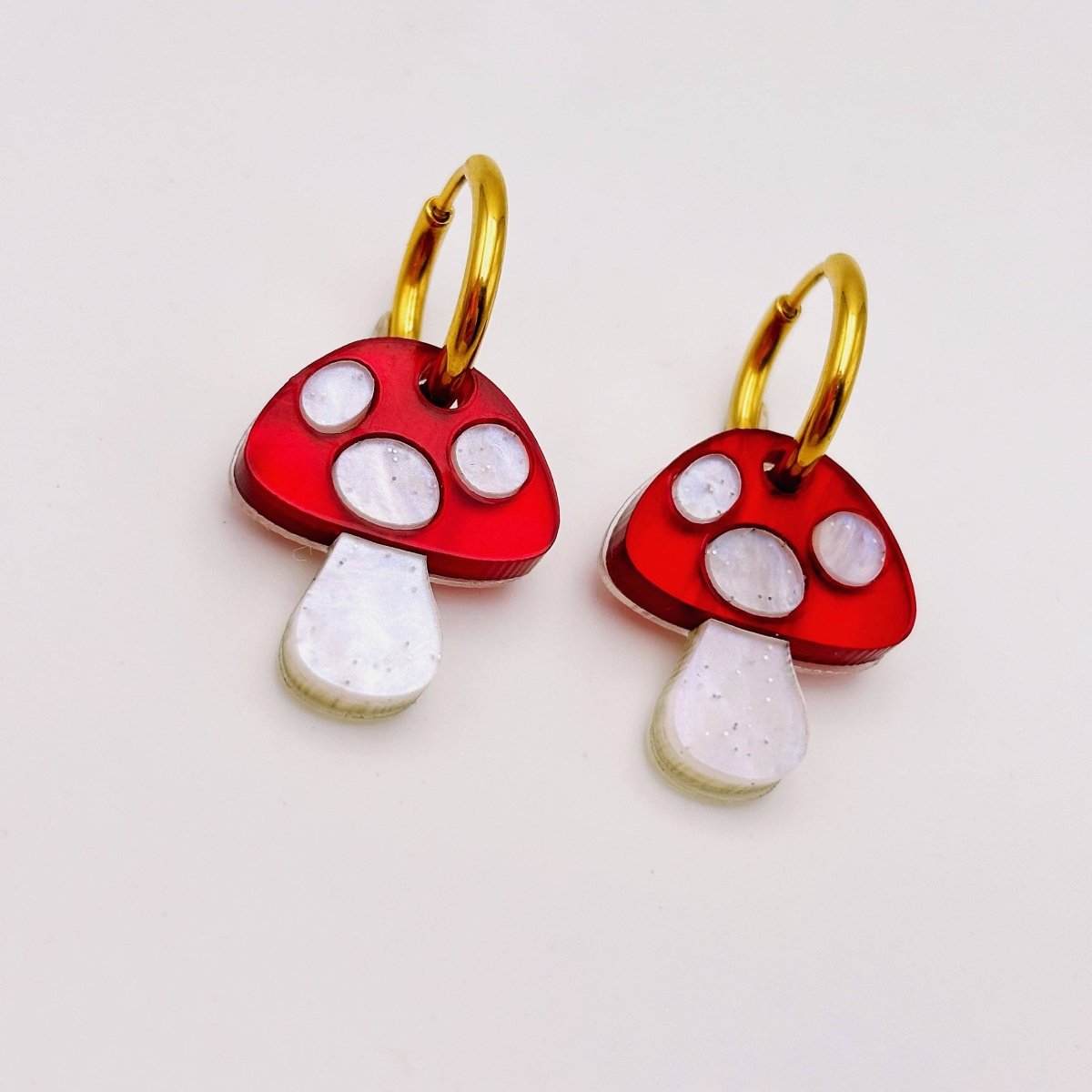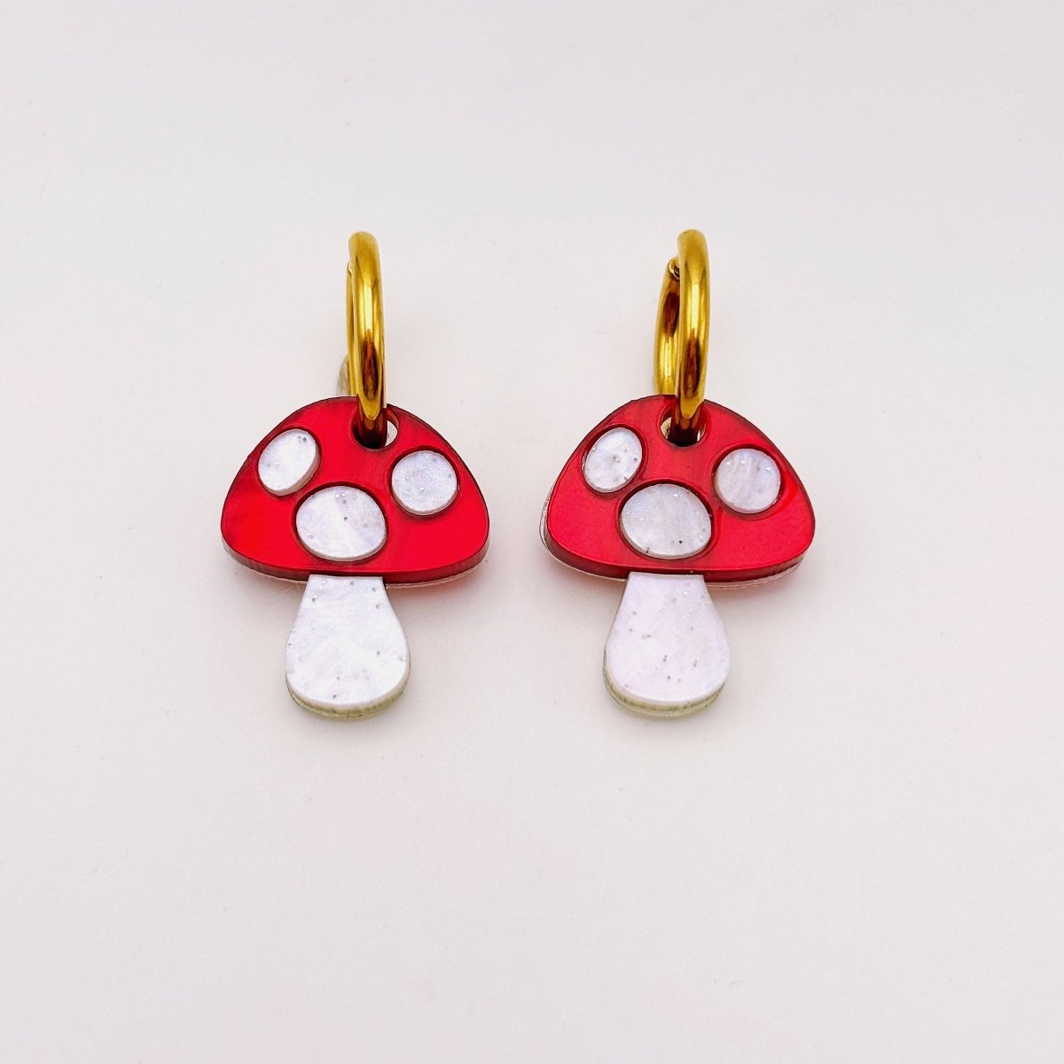 Gi antrekket ditt et fargerikt og lekent løft med disse sjarmerende, små marmorerte øredobbene med røde og hvite sopper, laget i Frankrike! De livlige røde og hvite nyansene, kombinert med et klart akryldesign i bunn og litt glitter, vil fange lyset og oppmerksomheten på en søt og morsom måte. Disse øredobbene er designet for å være både iøynefallende og superkomfortable, perfekte til både hverdagsbruk eller kanskje en julefest.