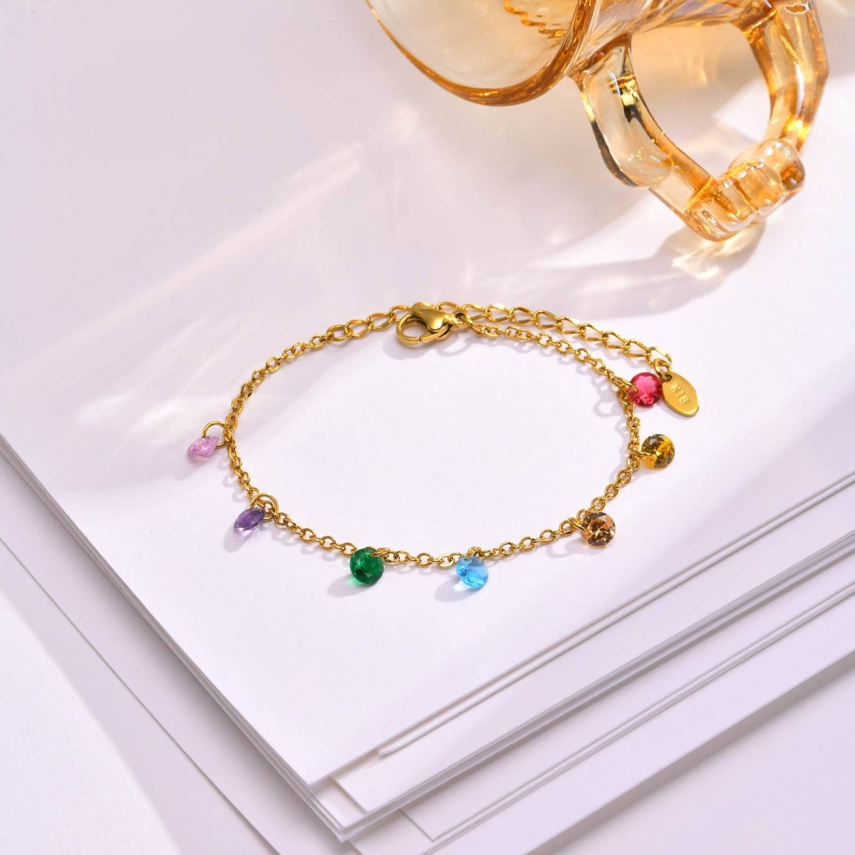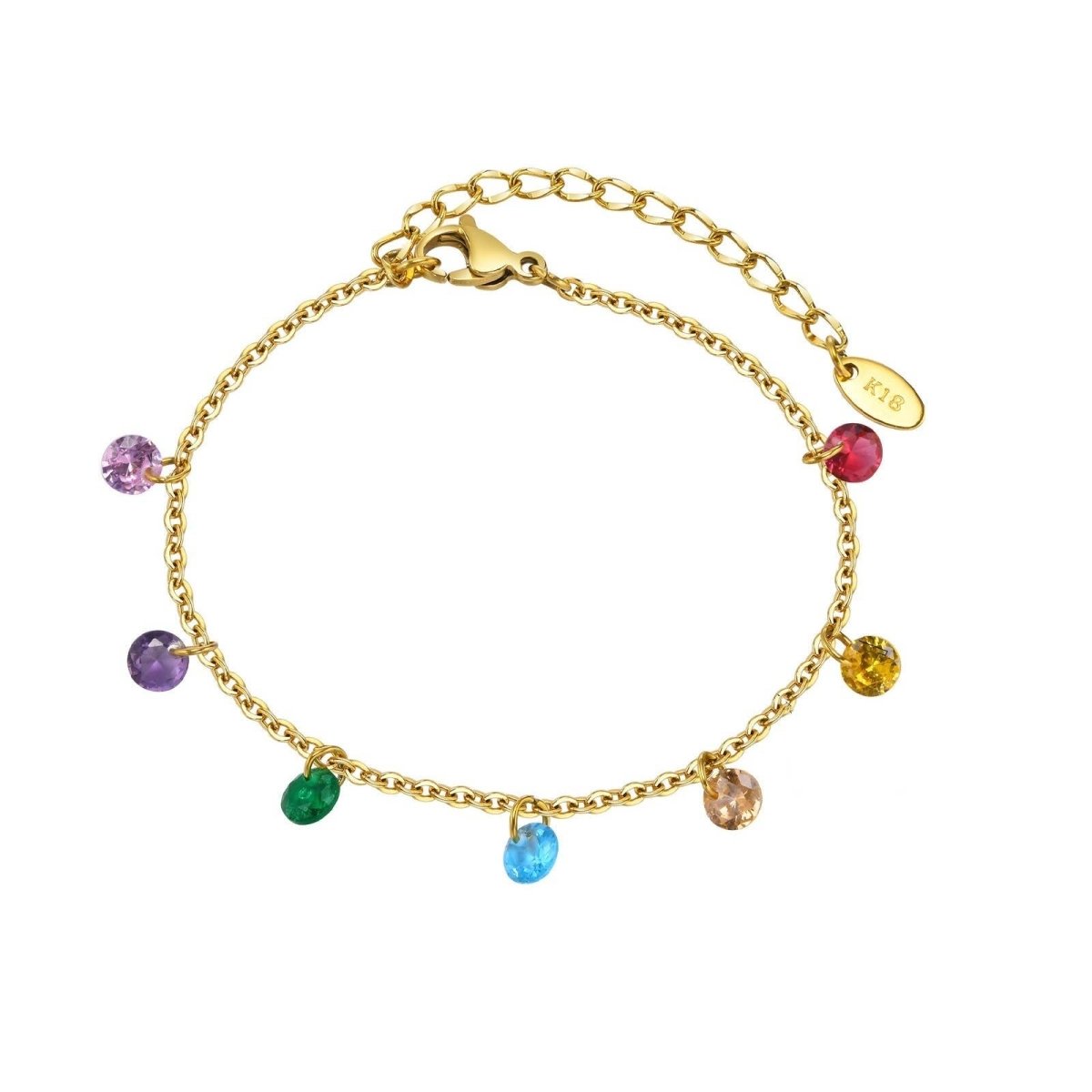Armbånd med runde fargerike Zirkonia steiner. Laget av rustfritt stål forgylt med 18K ekte gull.