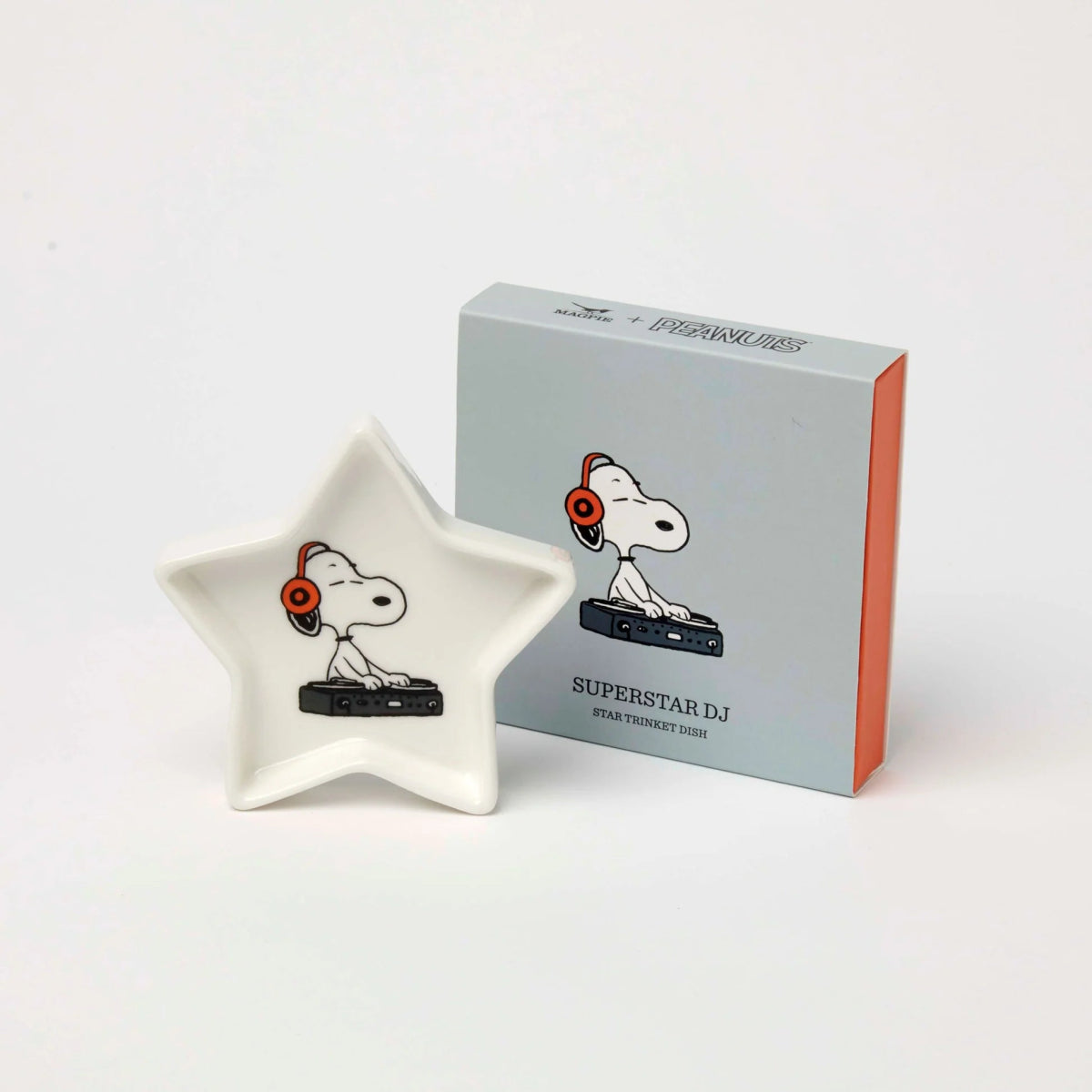 Stjerneformet skål dekorert med Snoopy som er DJ. Den er perfekt som en liten skål for smykker, og gjør seg flott som dekorasjon.