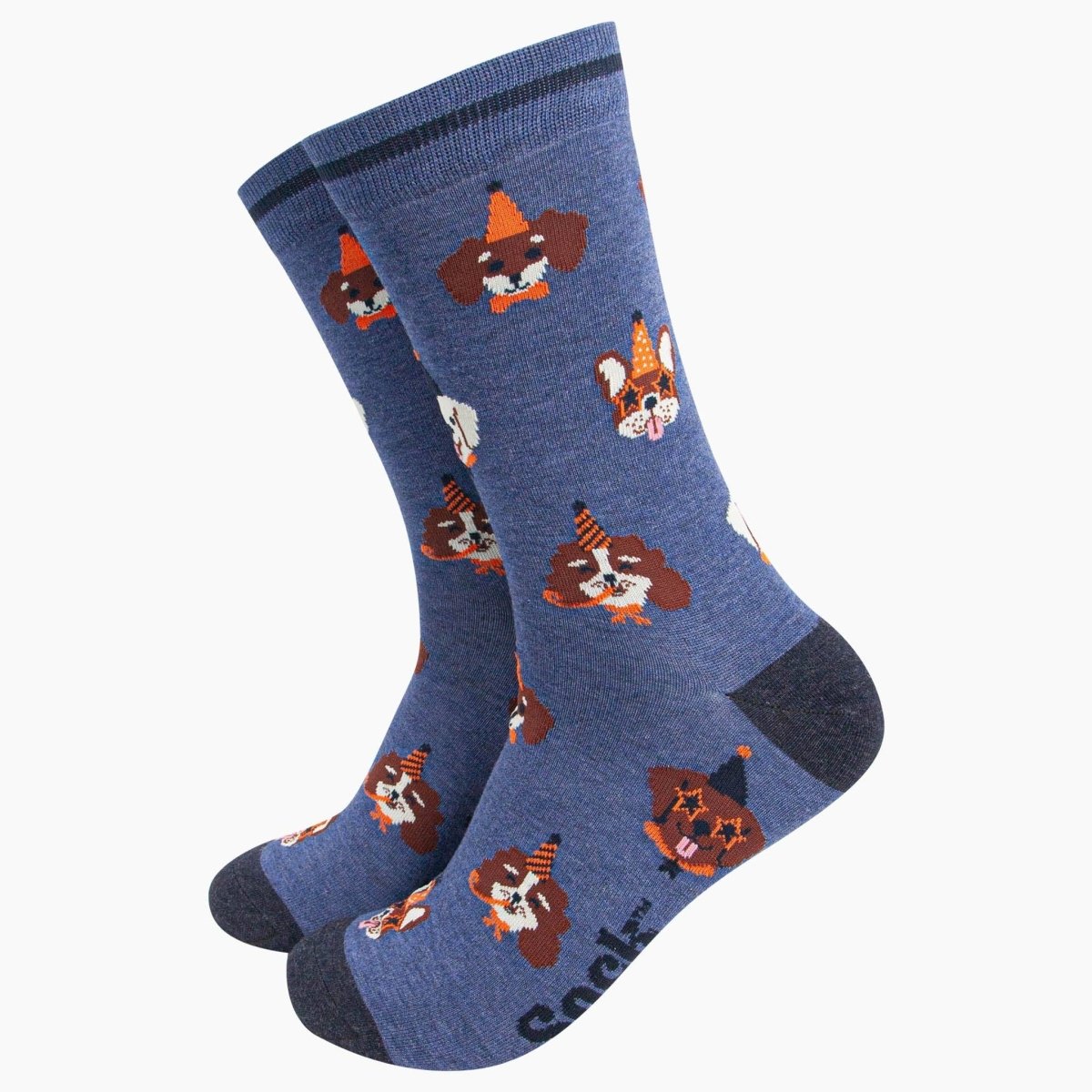 Bambussokker i denimblått med søte hunder i partyhatter. Størrelse 41-45.