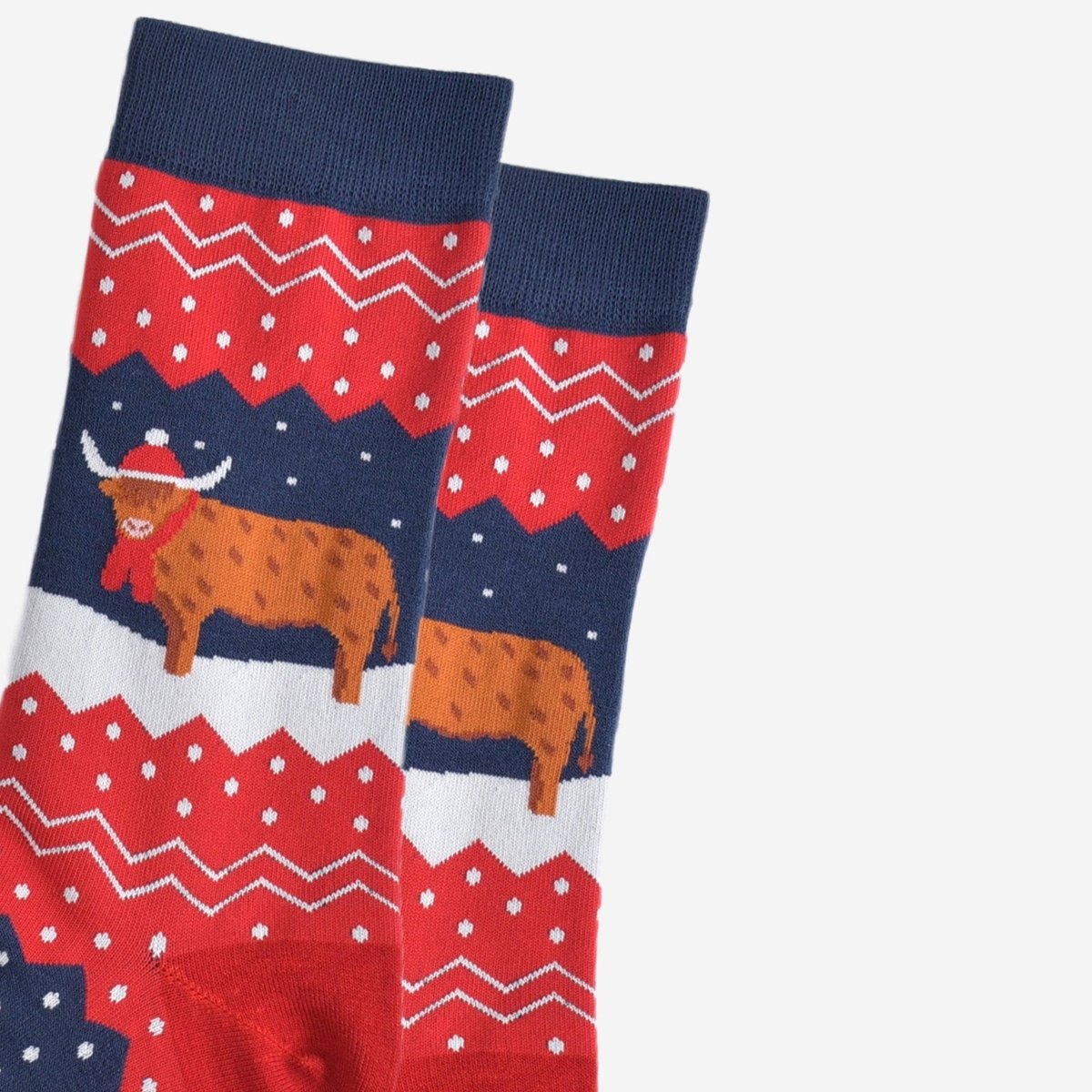 Bambussokker i marineblått og rødt med høylandsfe i lue og skjerf. Størrelse 41-45.