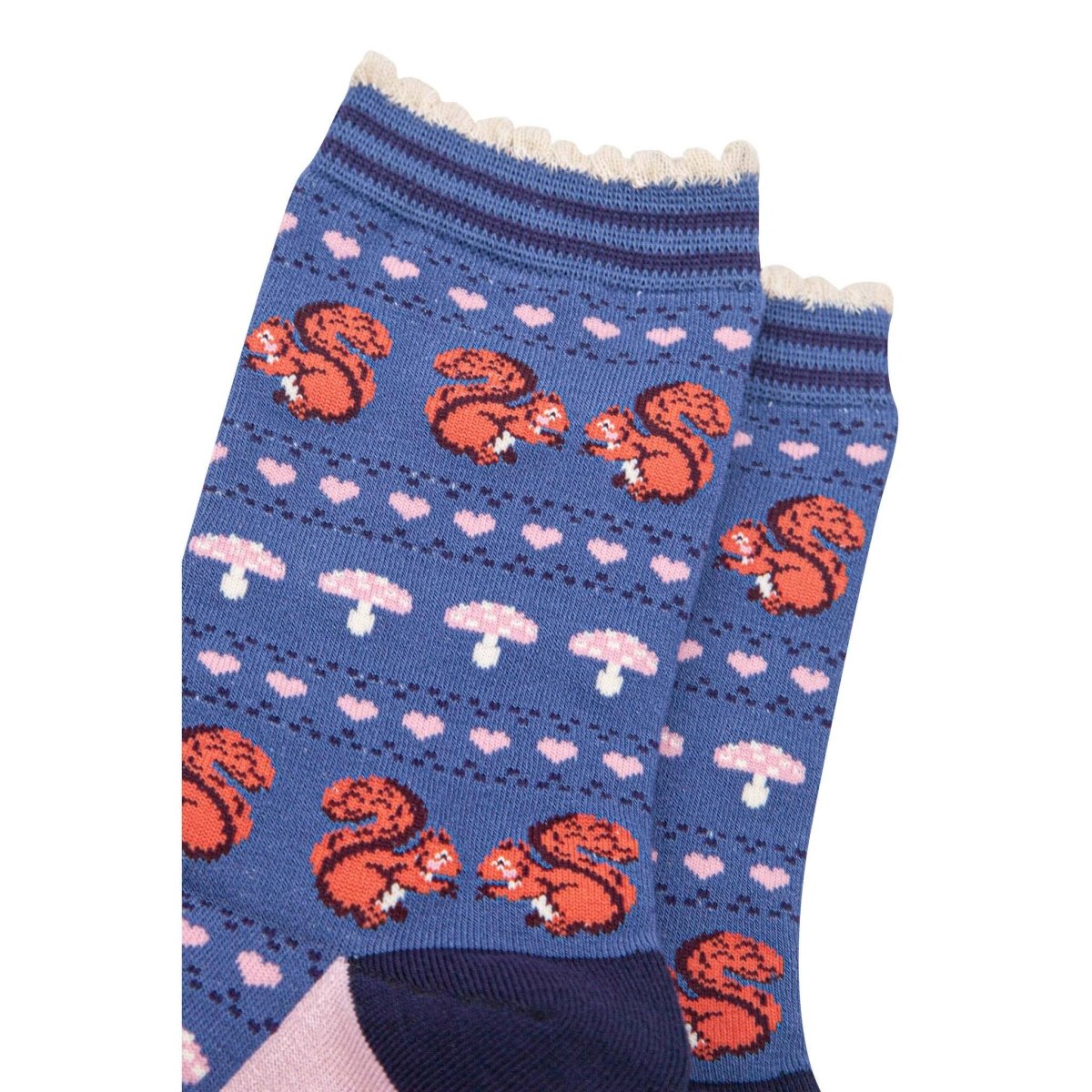 Bambussokker i denimblått med ekorn, hjerter og søte sopp på. Størrelse 36-40.