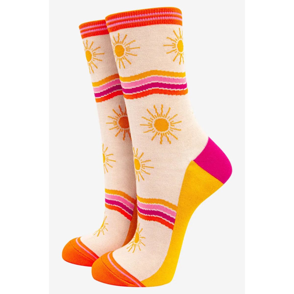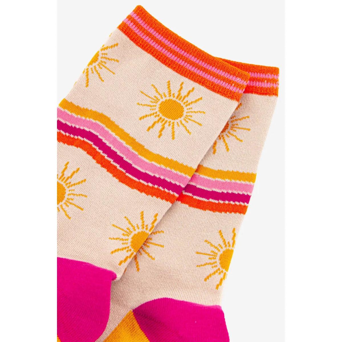 Bambussokker med i rosa, gul, lilla og oransje med soler. Størrelse 36-40.