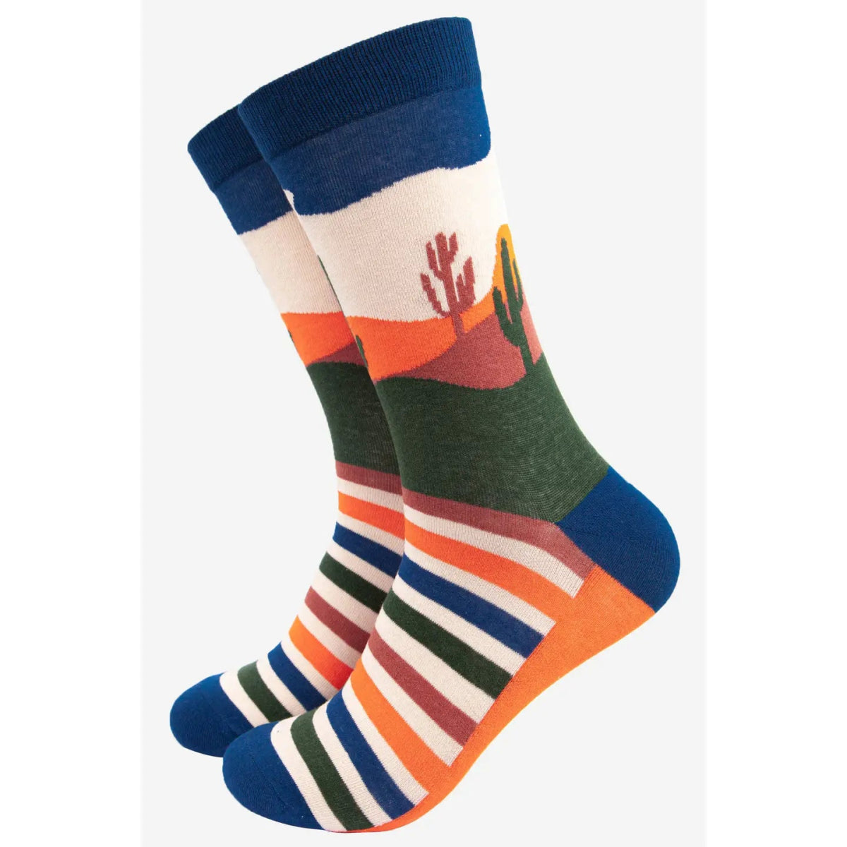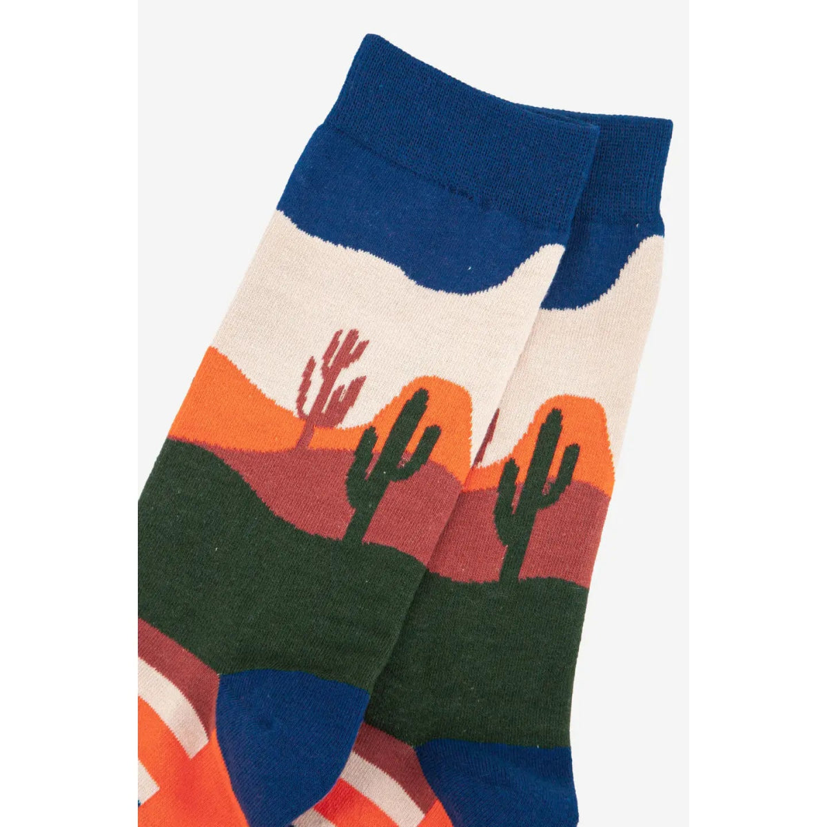 Bambussokker i jordfarger med blå kanter og ørkenmotiv. Størrelse 41-45.