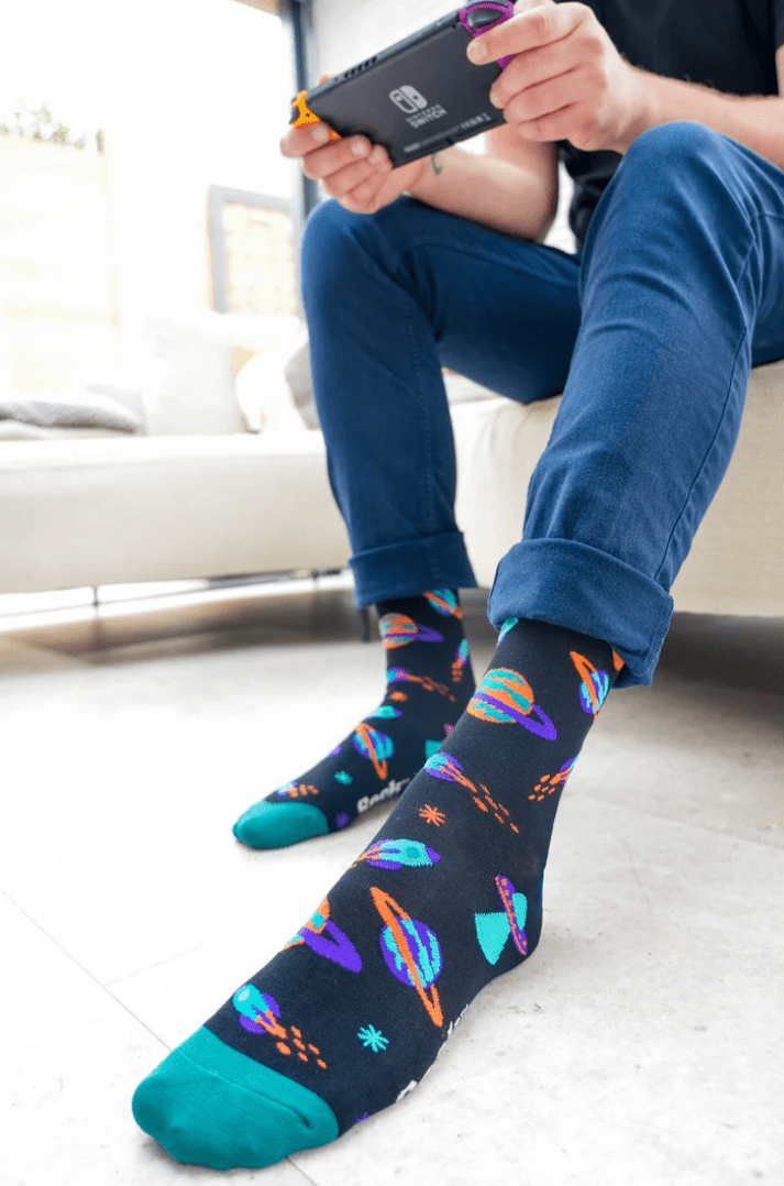 Bambussokker i sort med tealgrønne kanter, planeter, romskip og ufoer. Størrelse 41-45.