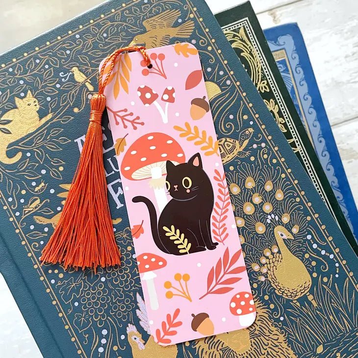 Dobbeltsidig bokmerke med oransje dusk med en søt liten svart katt.