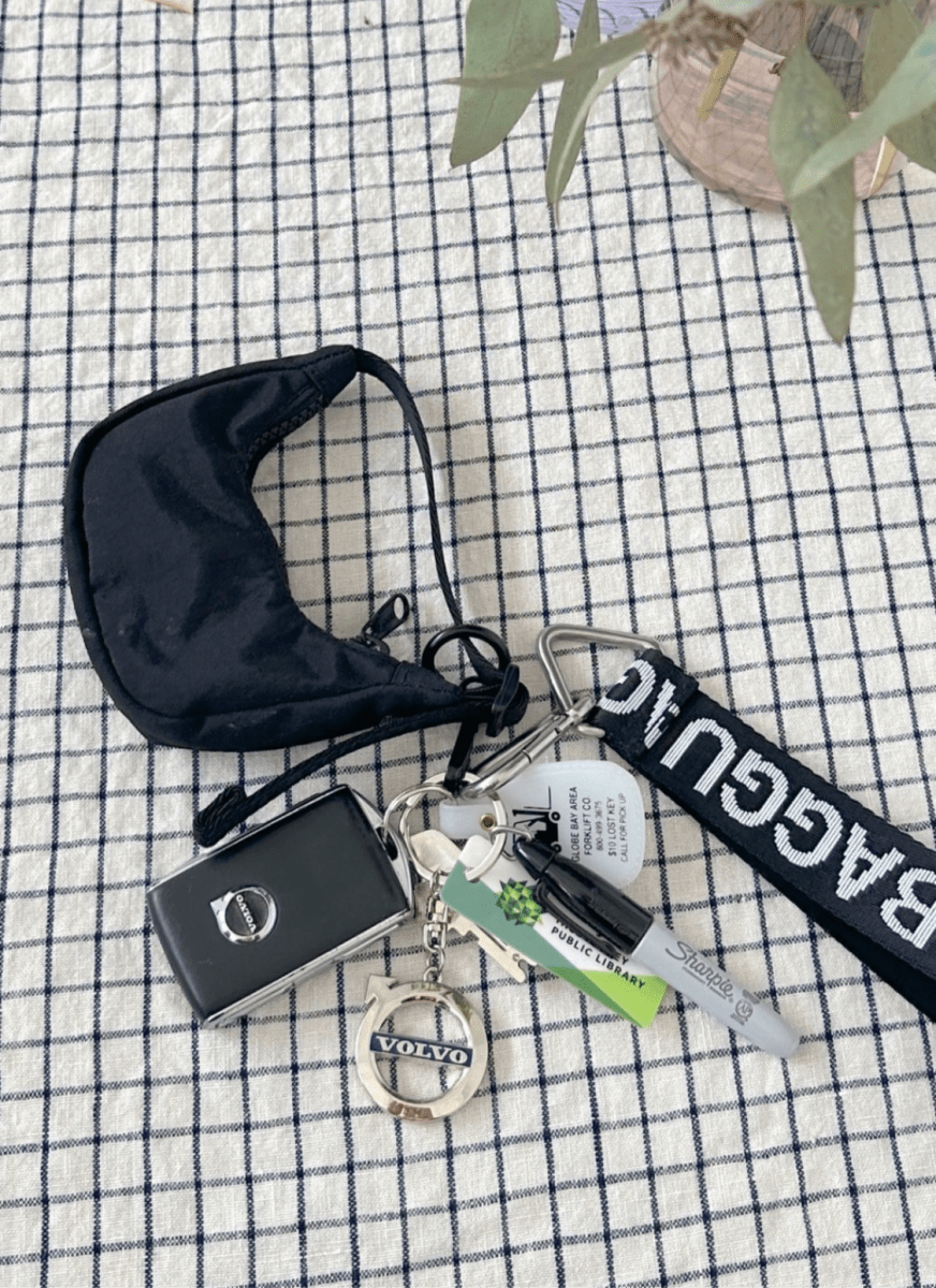 En bitteliten veske! Crescent Bag charm pynter opp din større veske mens den holder små gjenstander som bankkort, nøkler eller leppepomade lett tilgjengelig.