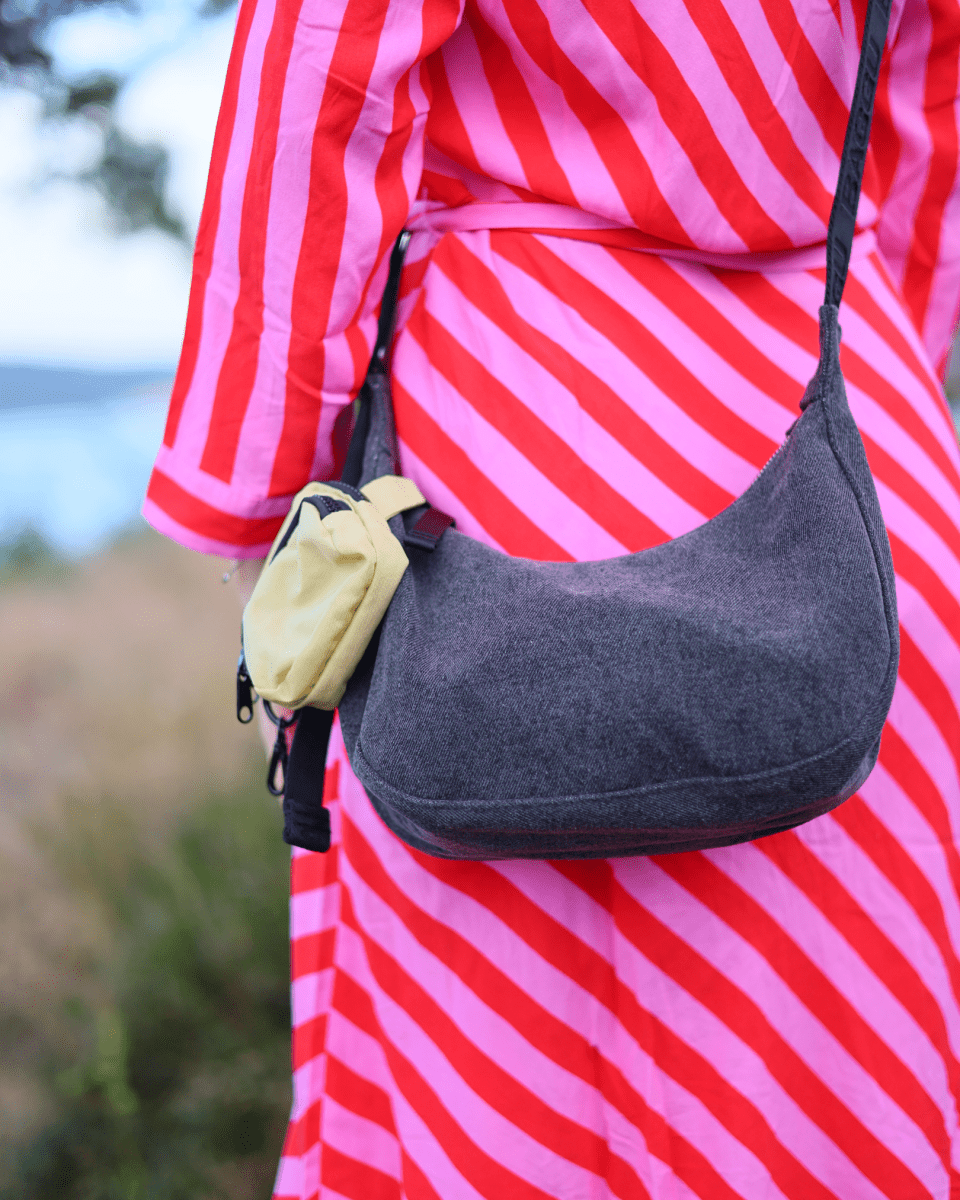 Small Denim Crescent Bag i Washed Black Denim. Designet for mer enn bare det nødvendige, med en praktisk innvendig lomme som holder orden på småtingene. Sleng den over skulderen eller bær den tvers over kroppen for en praktisk hands-free opplevelse.