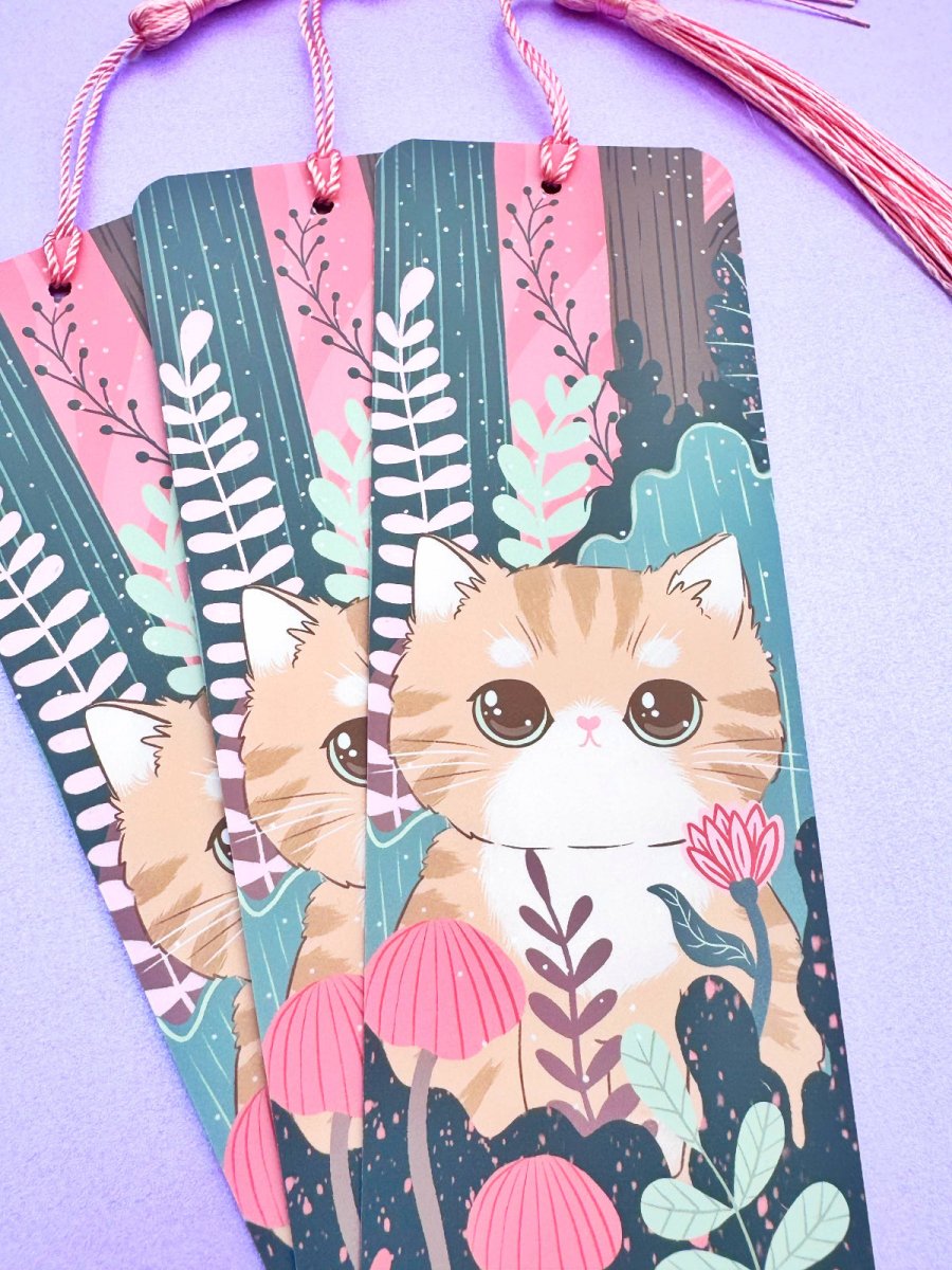 Dette dobbeltsidige bokmerket med rosa dusk har den søteste lille katten omgitt av blomster. Trykt på resirkulert tykt 350 g/m2 papir med matt laminat for å holde det vakkert.