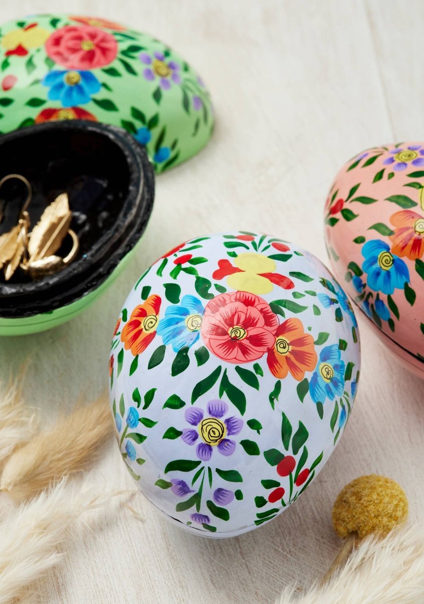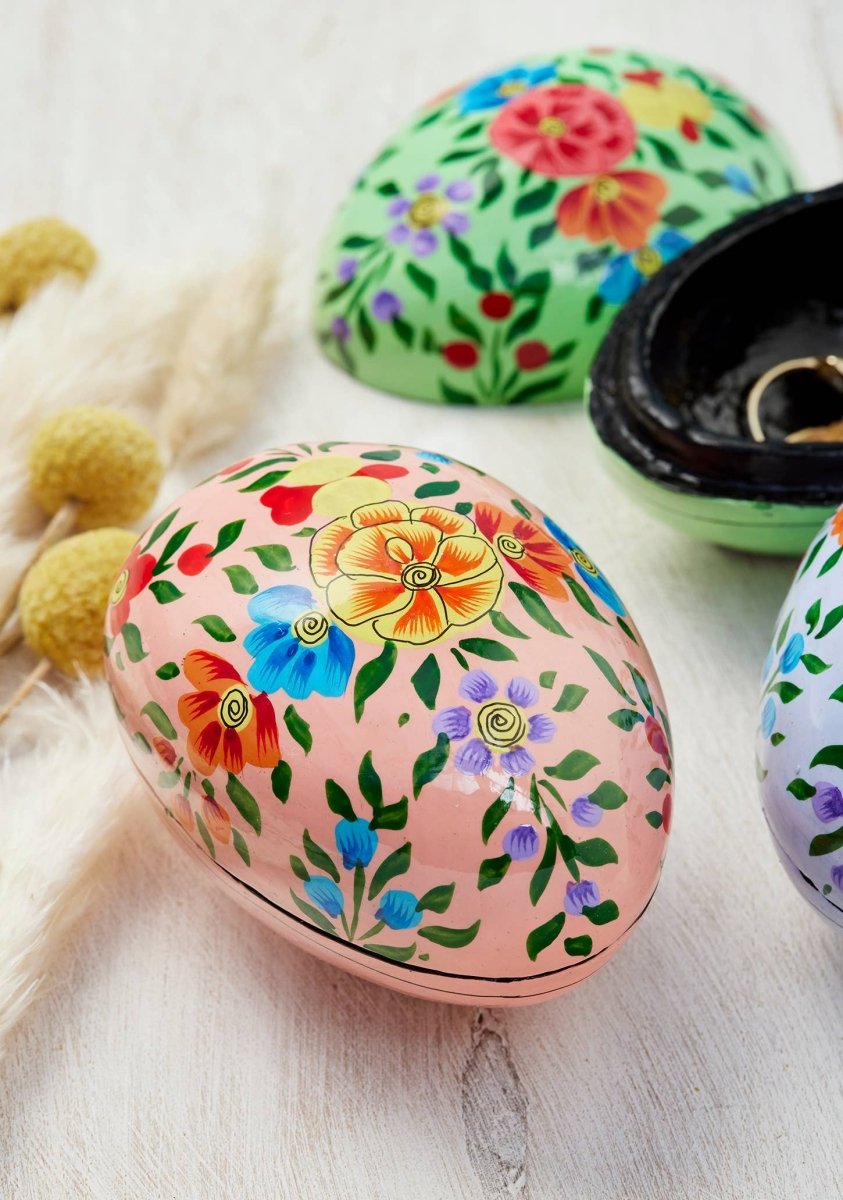 Eggformet oppbevaringsboks i to deler, håndmalt med blomstrete mønster og blank finish. Tilgjengelig i tre farger.