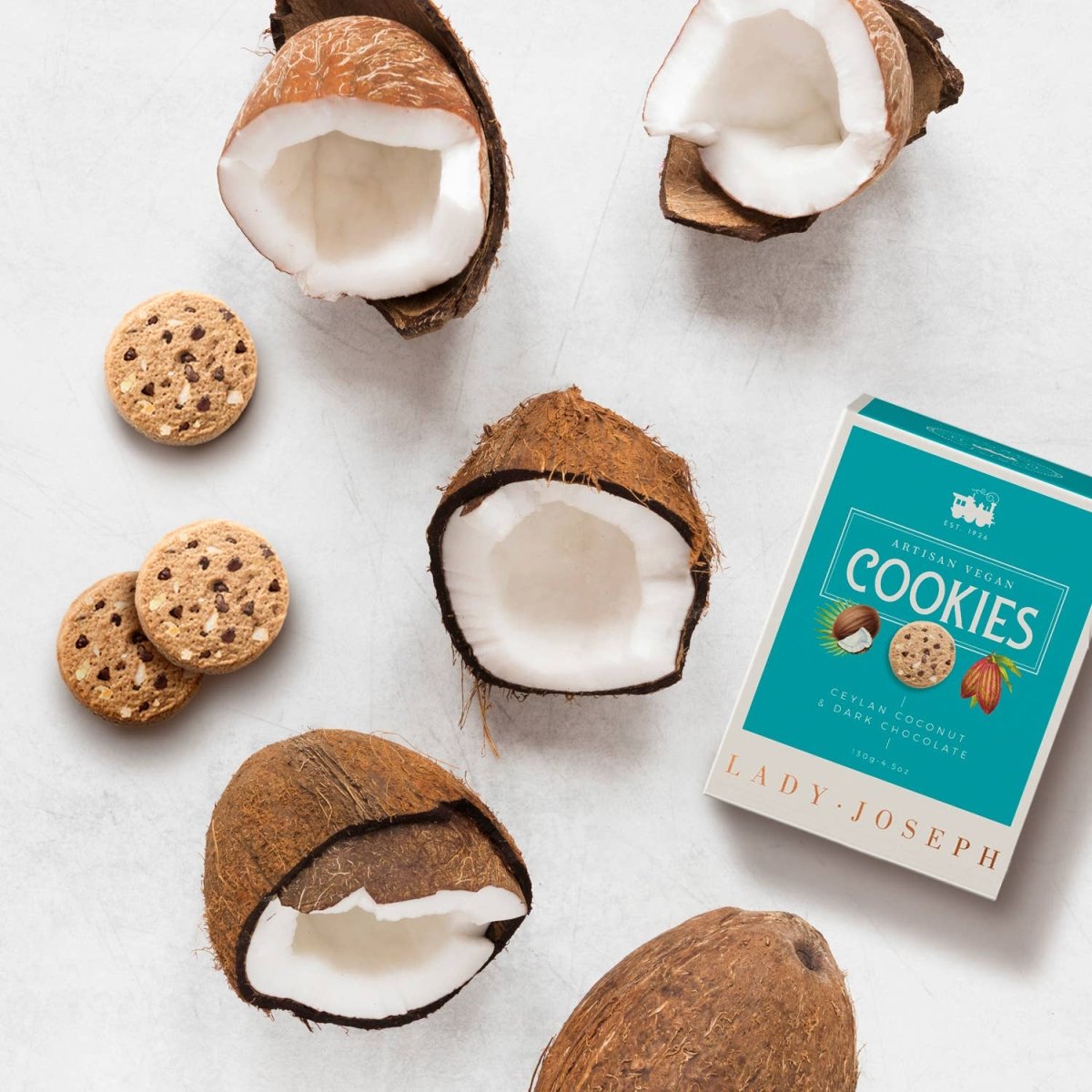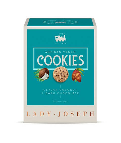 Vegansk kjeks med naturlige ingredienser og olivenolje. Sprø Ceylon-kokos og fyldig mørk sjokolade.