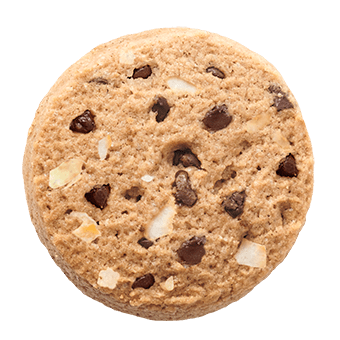 Inneholder: Hvetemel (gluten), vegetabilsk olje (oliven, kokos og solsikke), sukker, mørk sjokolade (kakao, sukker, kakaosmør, solsikke lecithin) (15%), dehydrert kokosnøtt (5%), salt (kan inneholde spor av egg, melk og nøtter).